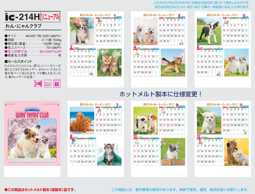 ・ペット,2026年度 カレンダー,ic214,★人気のカレンダー最安値,ic-214,IC214,わん・にゃんクラブ