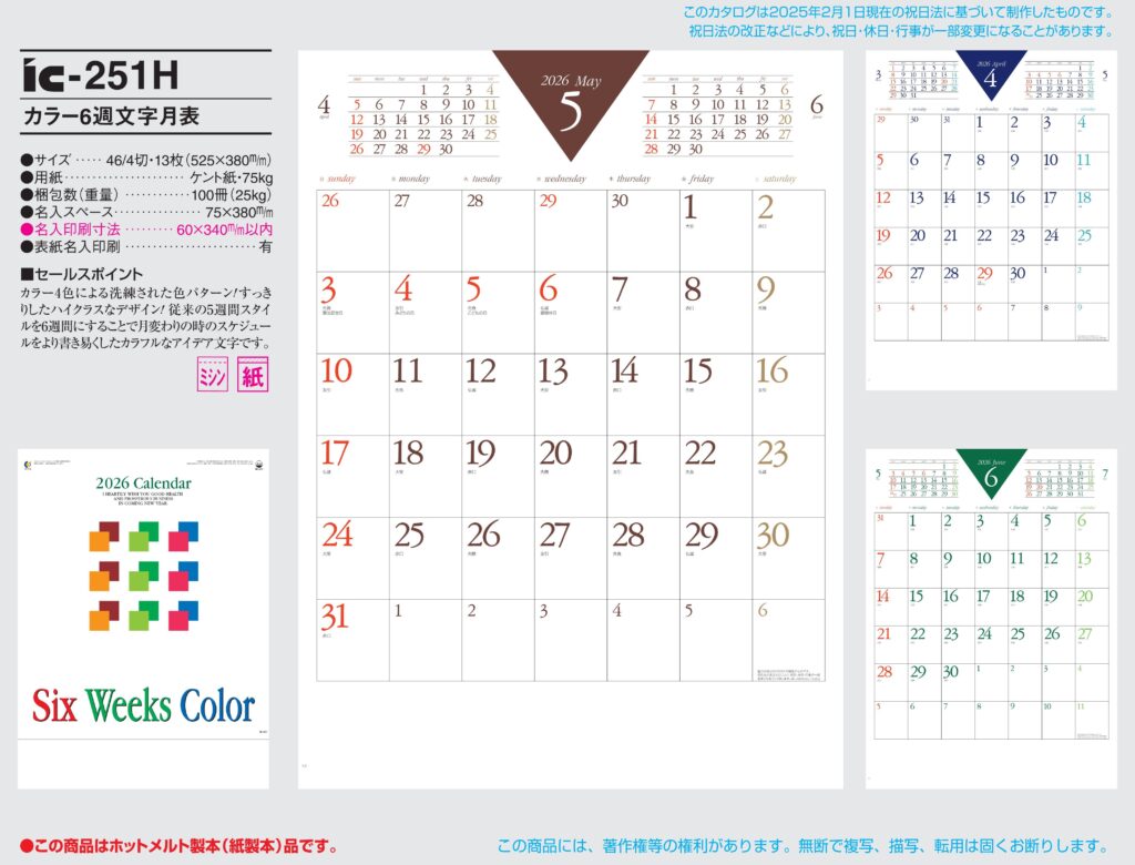 品番 : IC-251 46/4x13 カラー6週文字月表 : 2026年版