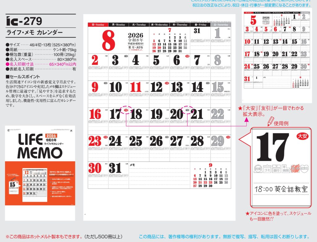 品番 : IC-279 46/4×13 ライフ・メモ カレンダー : 2026年版