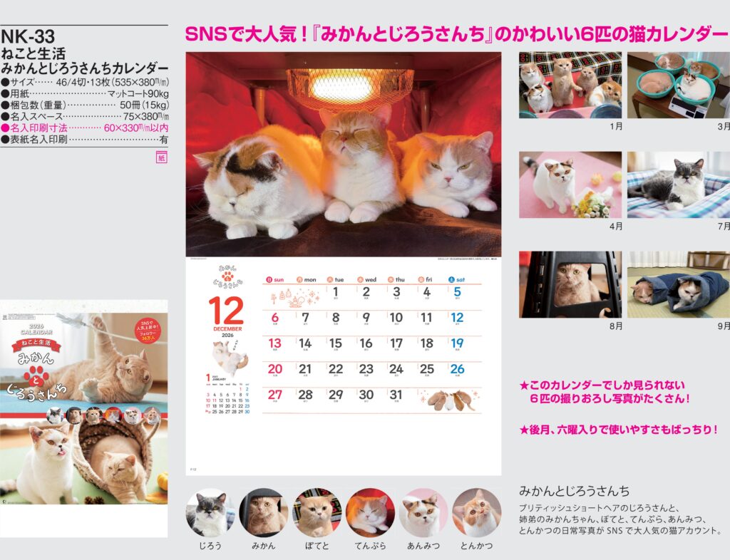品番 : NK-033 B4-13 ねこと生活みかんとじろうさんちカレンダー : 2026年版