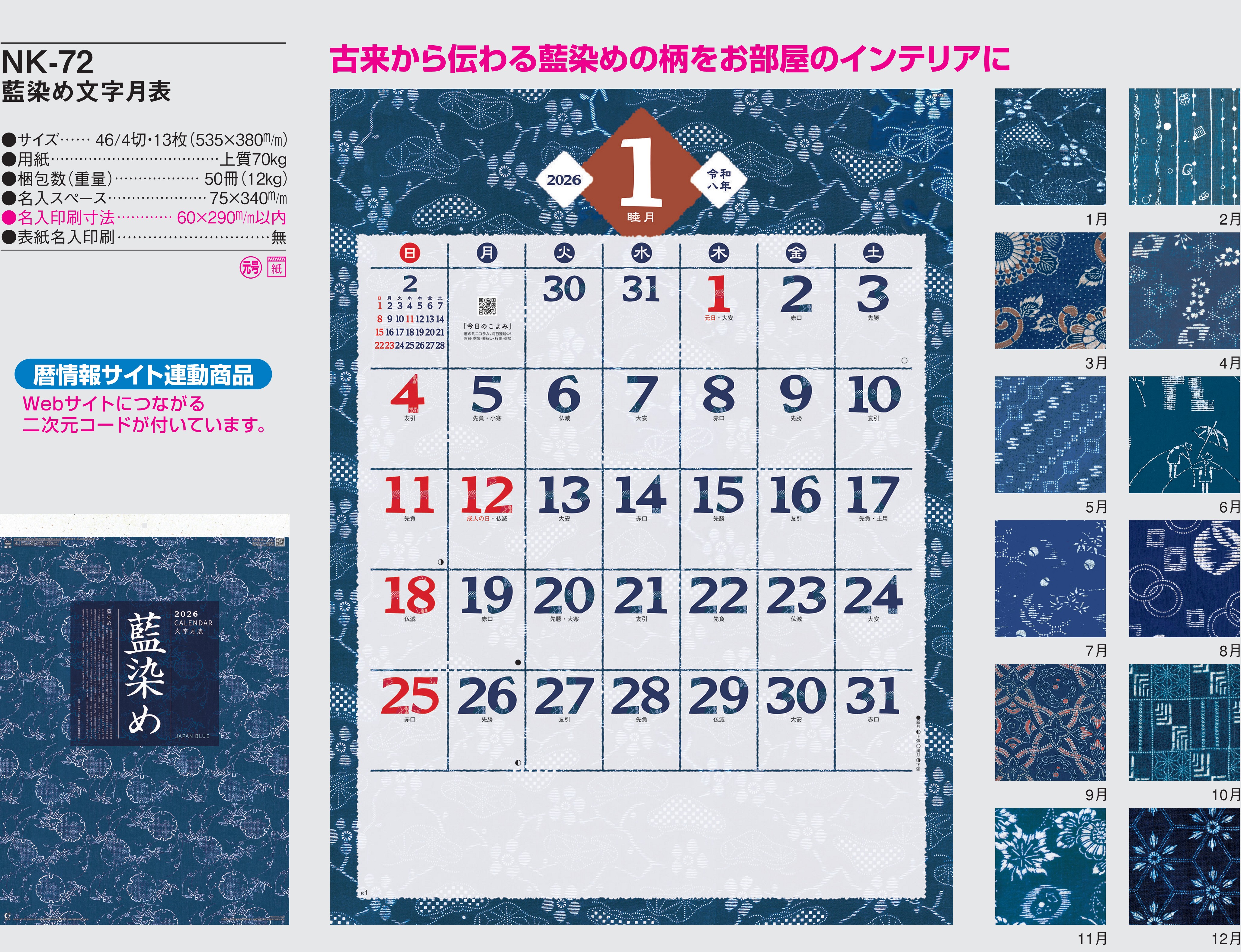 品番 : NK-072 B4-13 藍染め文字月表 : 2026年版