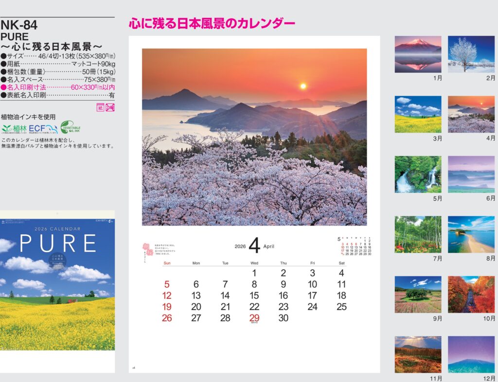 ・風景カレンダー,2026年度 カレンダー,nk084, 最安値,nk-084,NK084,PURE~心に残る日本風景~