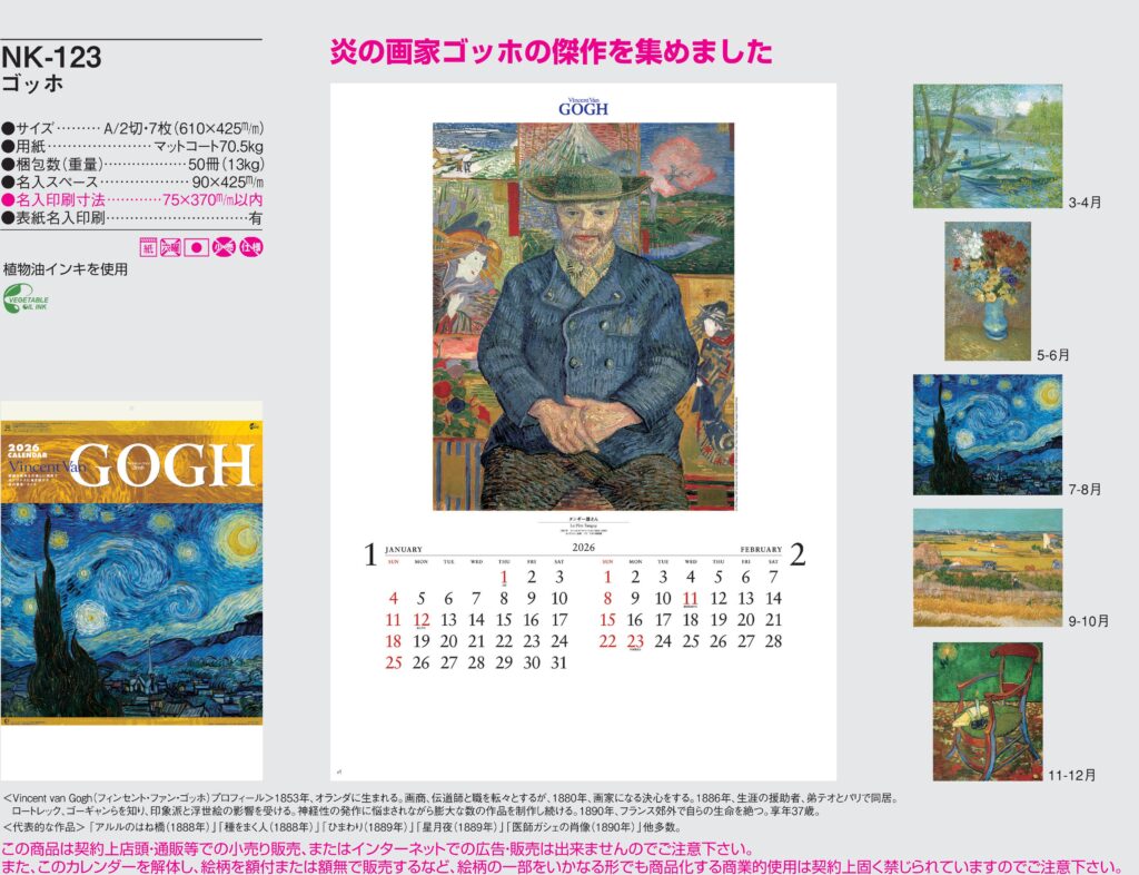 炎の画家ゴッホの傑作を集めました。名入れカレンダー本舗 NK123