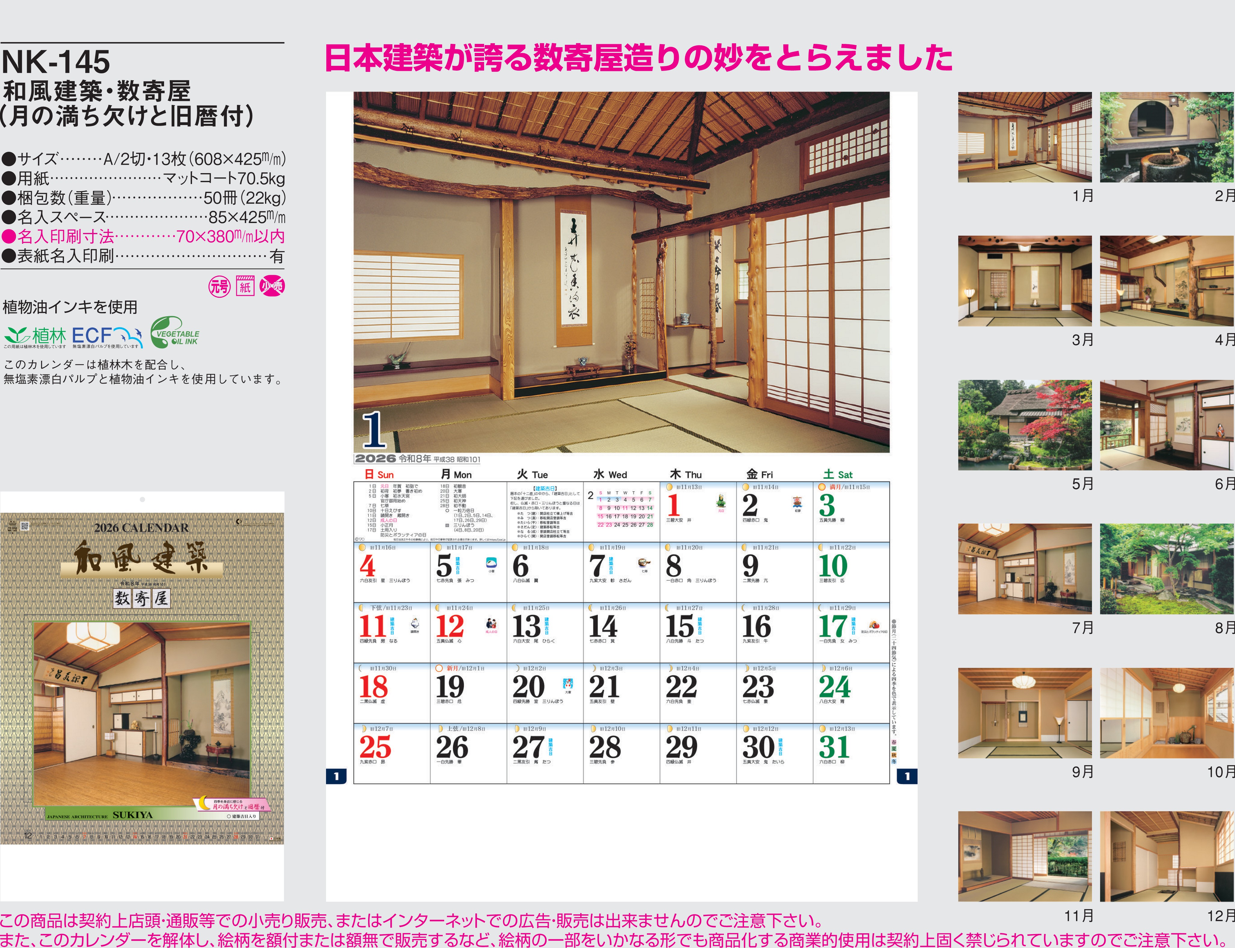 ・建築ハウジングカレンダー,2026年度 カレンダー,nk145, 最安値,nk-145,NK145,和風建築・数寄屋
