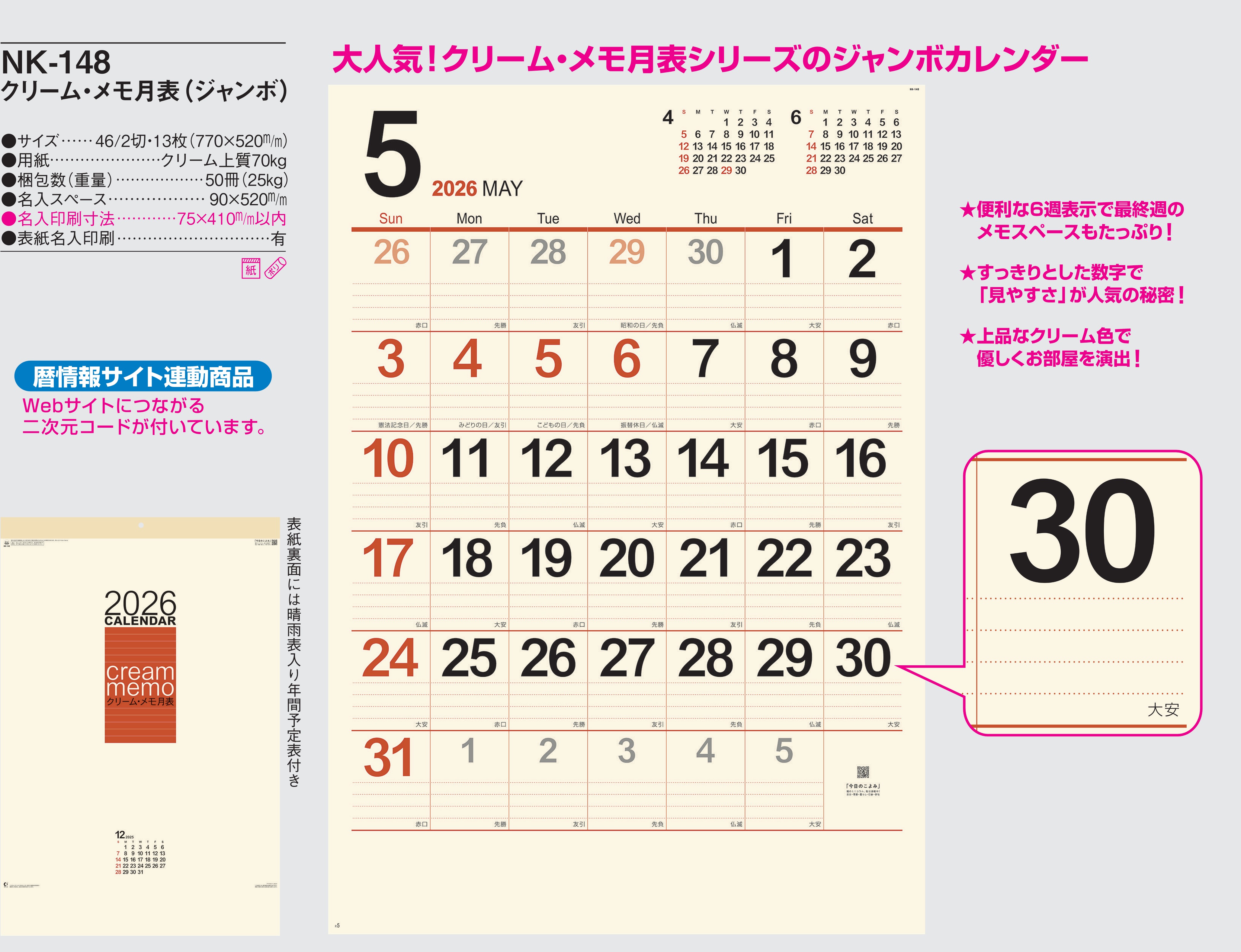人気のクリーム・メモ月表シリーズに、ジャンボが登場 NK148