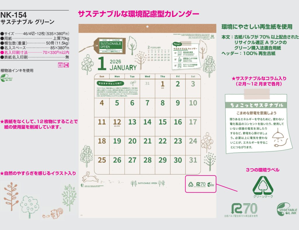 ・ -,2026年度 カレンダー,nk154, 最安値,nk-154,NK154,サステナブルグリーン