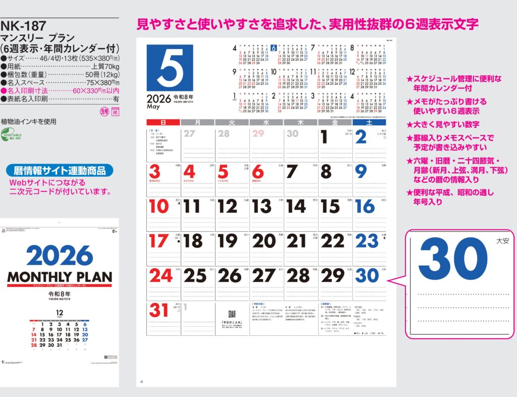 ・ -,2026年度 カレンダー,nk187, 最安値,nk-187,NK187,マンスリープラン