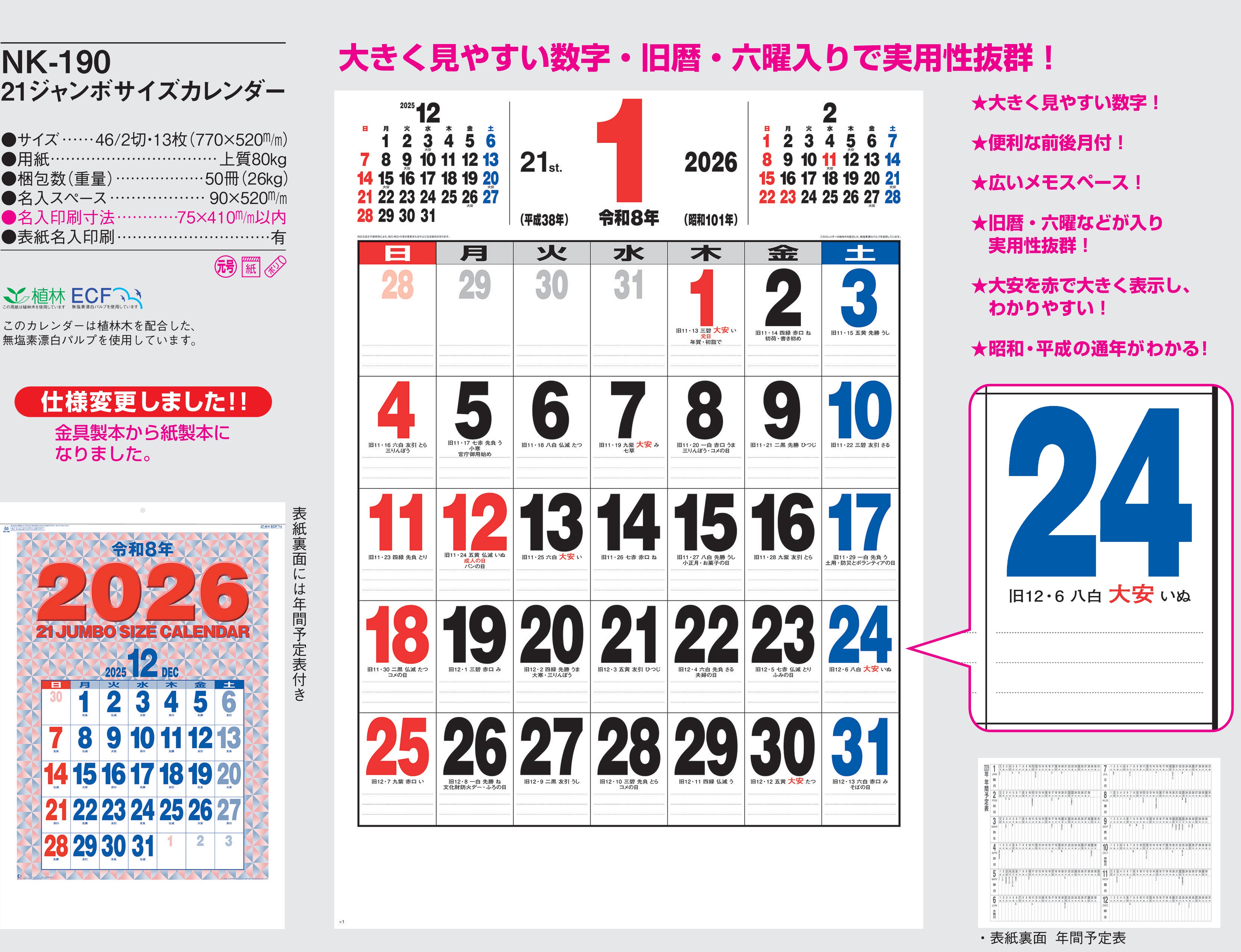 品番 : NK-190 B2-13 21ジャンボサイズカレンダー : 2026年版