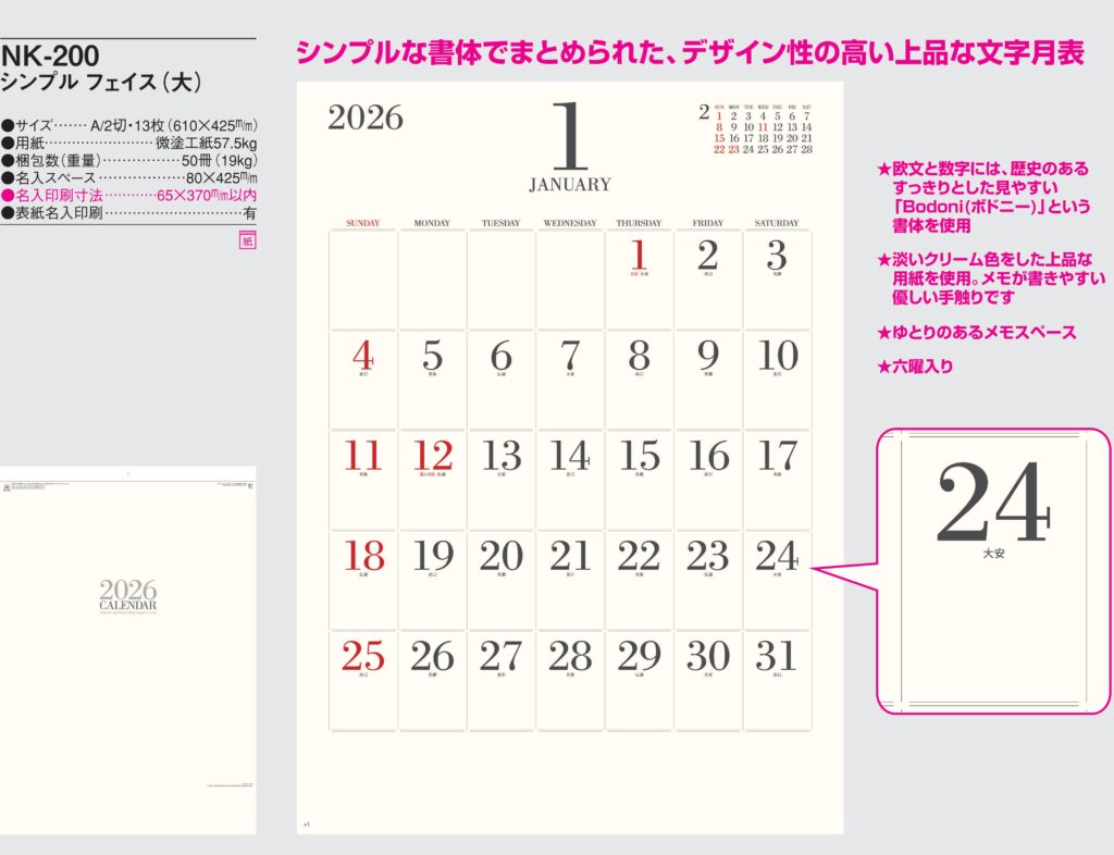 ・文字月表,2026年度 カレンダー,nk200, 最安値,nk-200,NK200,シンプルフェイス(大)