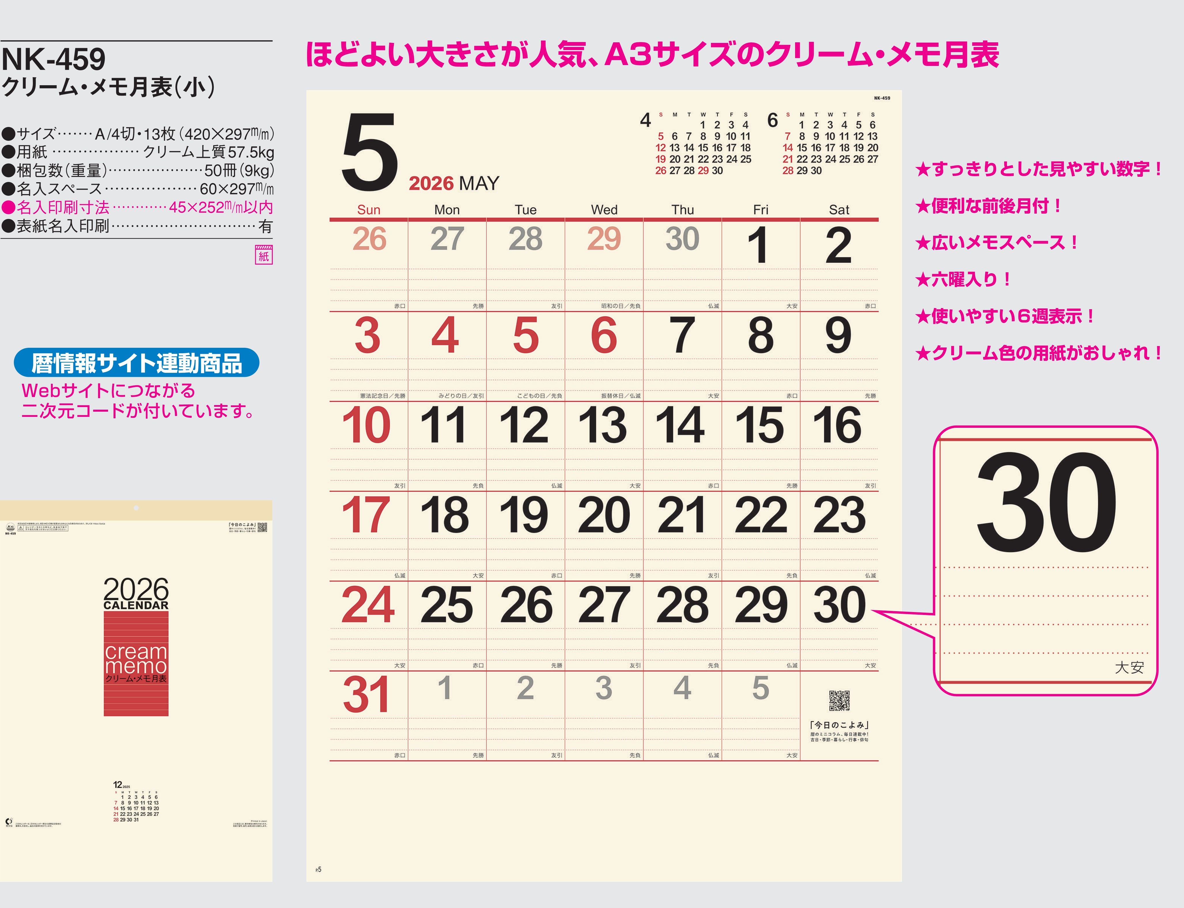 ・ -,2026年度 カレンダー,nk459, 最安値,nk-459,NK459,クリーム・メモ月表(小)
