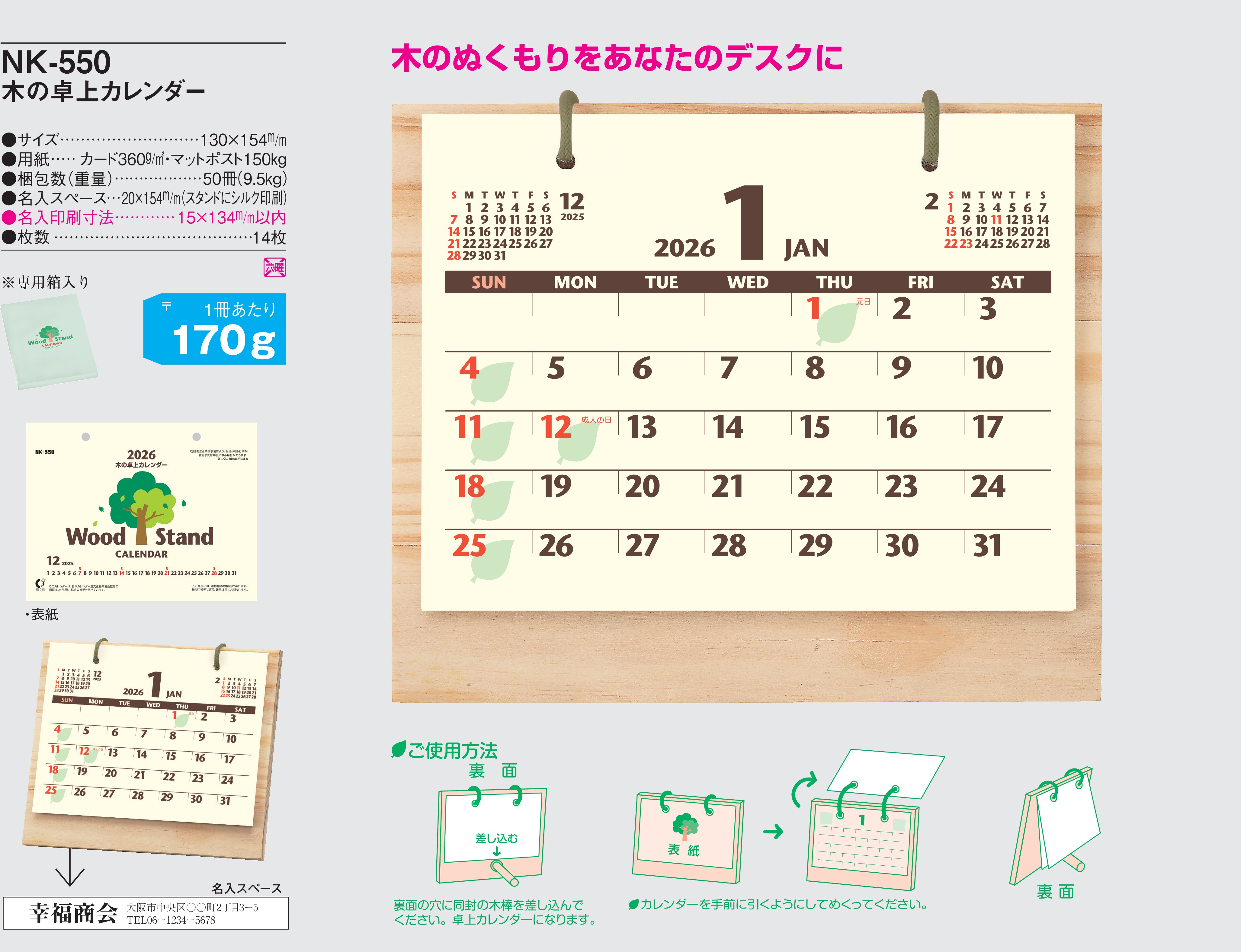 品番 : NK-550 卓上 木の卓上カレンダー : 2026年版