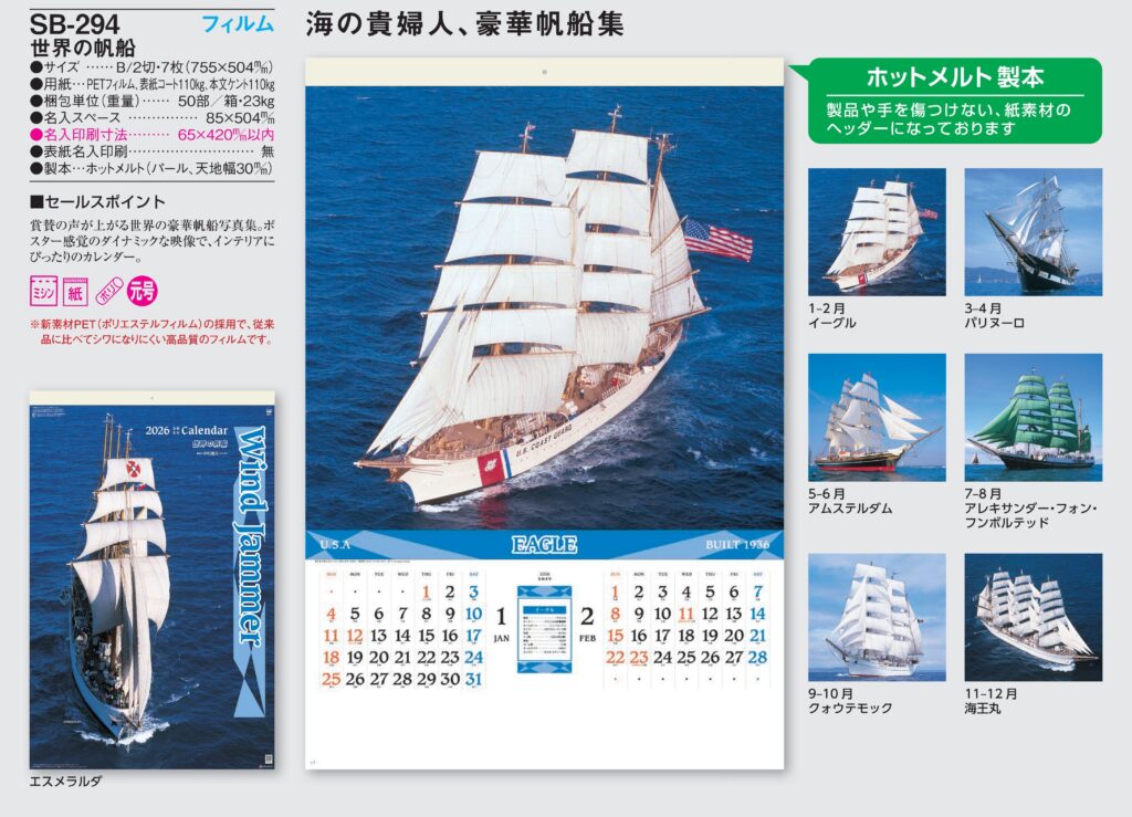・B2フィルム,2026年度 カレンダー,sb294, 最安値,sb-294,SB294,世界の帆船 フィルム