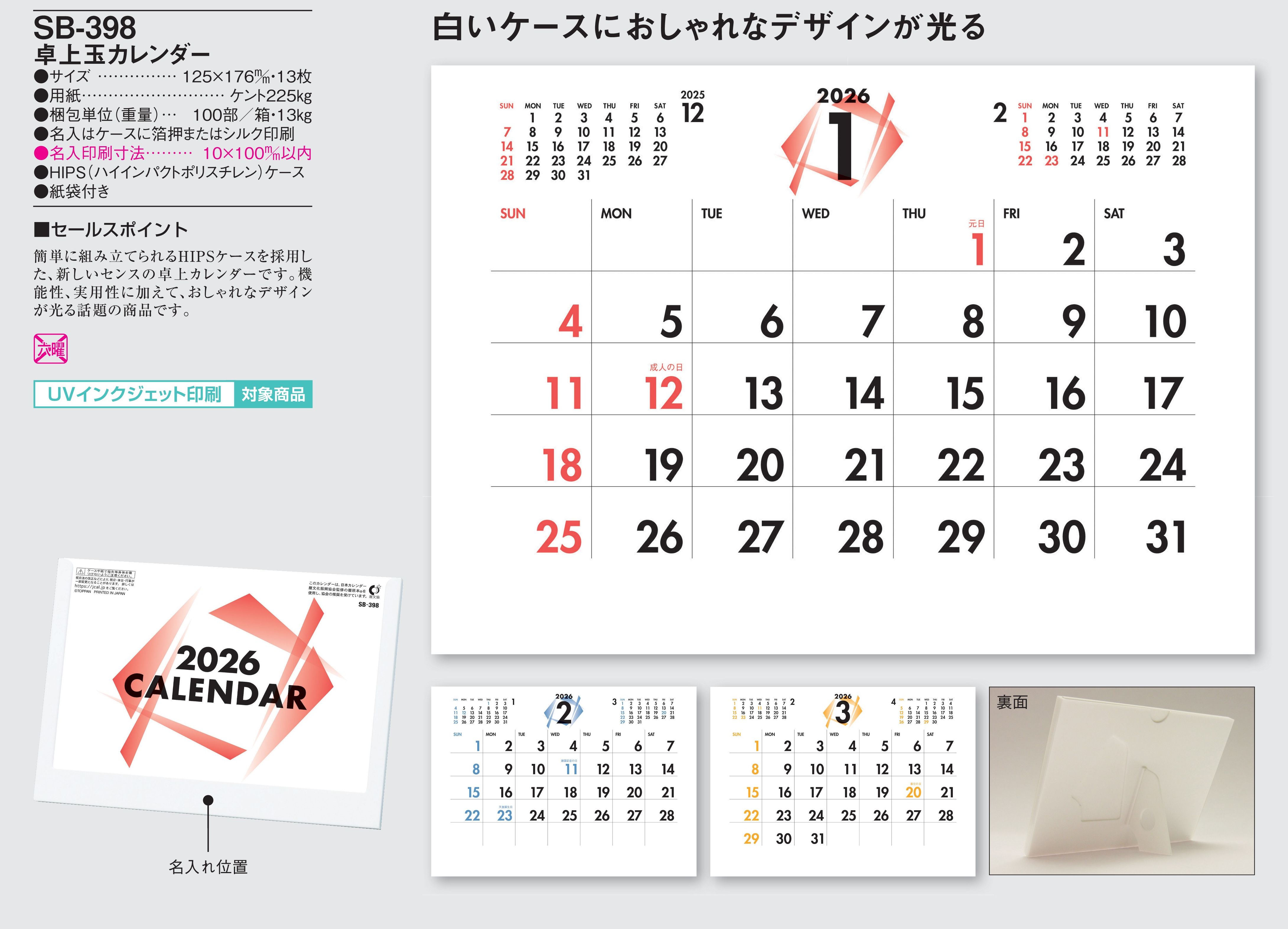 品番 : SB-398 125×176/13 卓上玉カレンダー : 2026年版