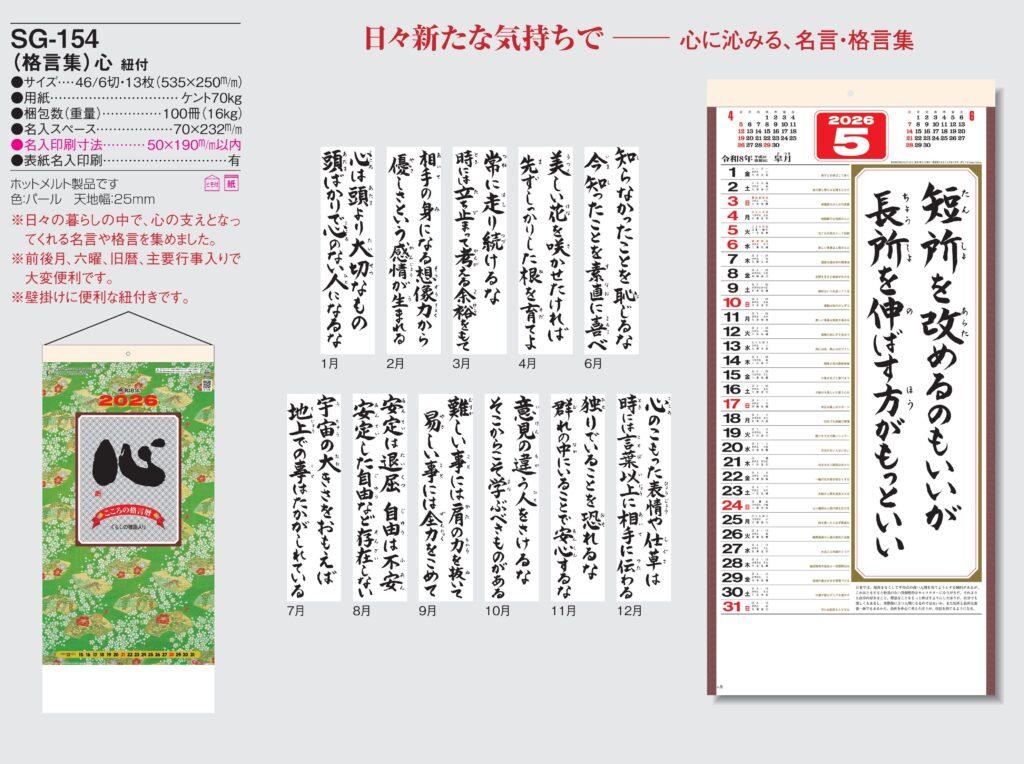 ・格言,2026年度 カレンダー,sg154, 最安値,sg-154,SG154,(格言集) 心 紐付