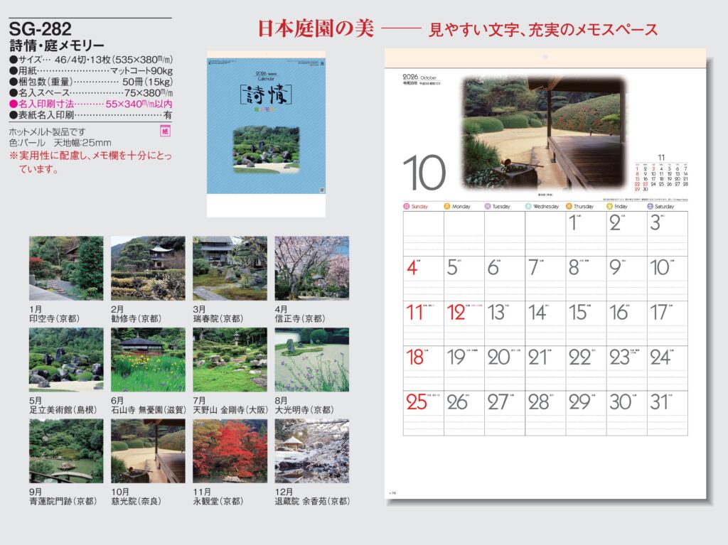 ・ -,2026年度 カレンダー,sg282, 最安値,sg-282,SG282,詩情・庭メモリー