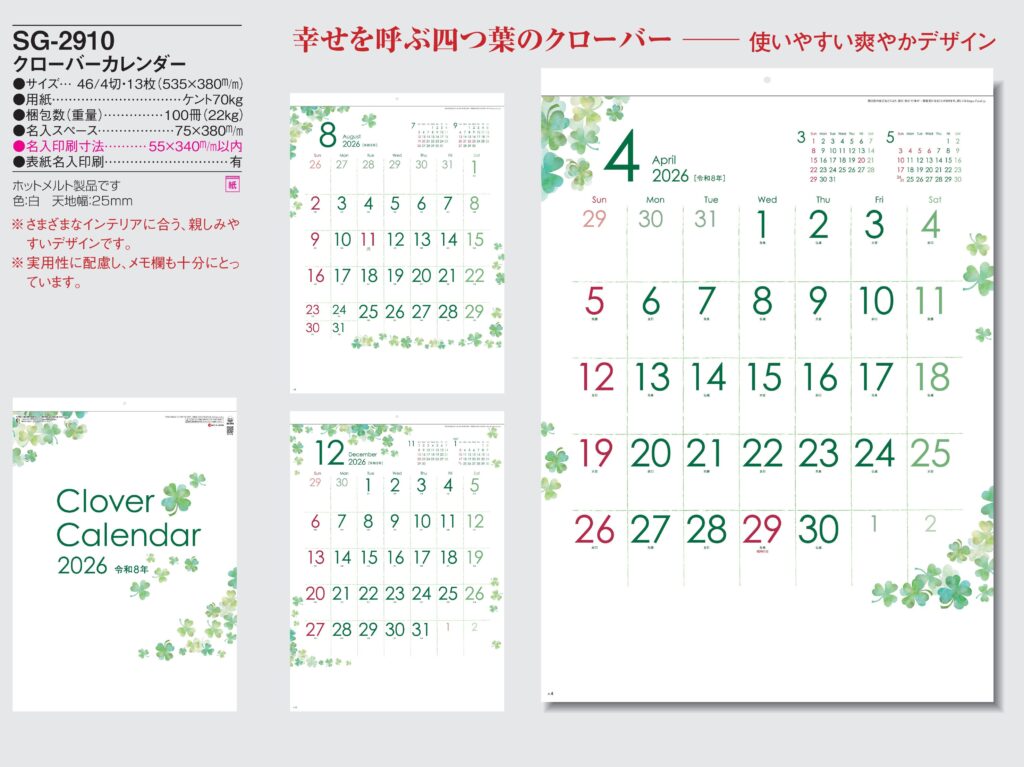 品番 : SG-2910 46/4-13 クローバーカレンダー : 2026年版