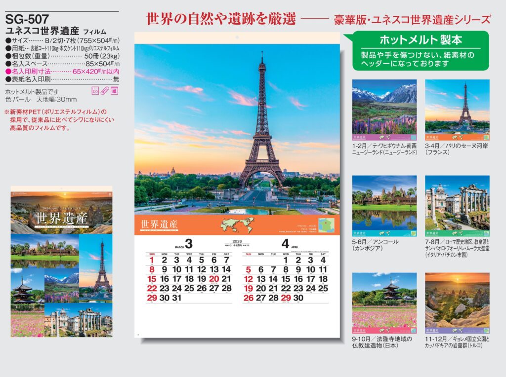 ・B2フィルム,2026年度 カレンダー,sg507, 最安値,sg-507,SG507,ユネスコ世界遺産