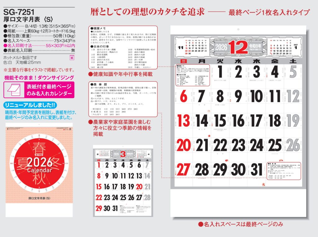 品番 : SG-7251 B/4-13 厚口文字月表〈S〉 : 2026年版