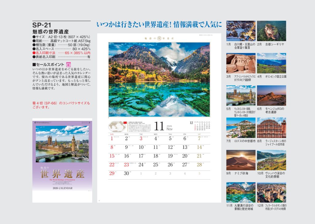 ・風景カレンダー,2026年度 カレンダー,sp021, 最安値,sp-021,SP021,魅惑の世界遺産