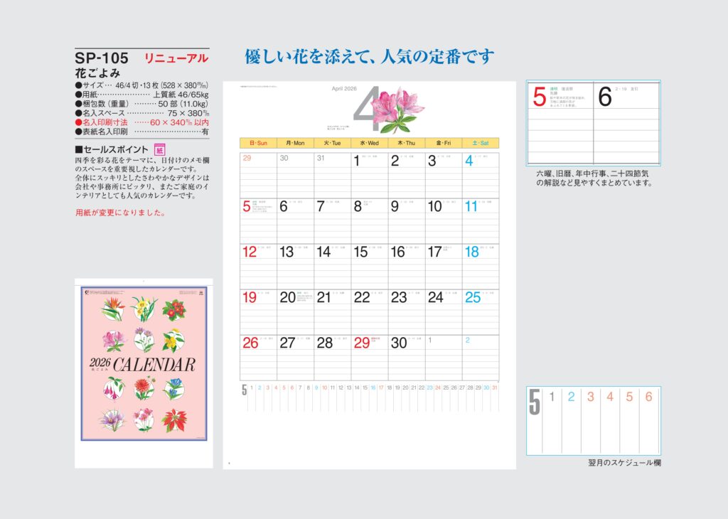 ・ -,2026年度 カレンダー,sp105, 最安値,sp-105,SP105,花ごよみ