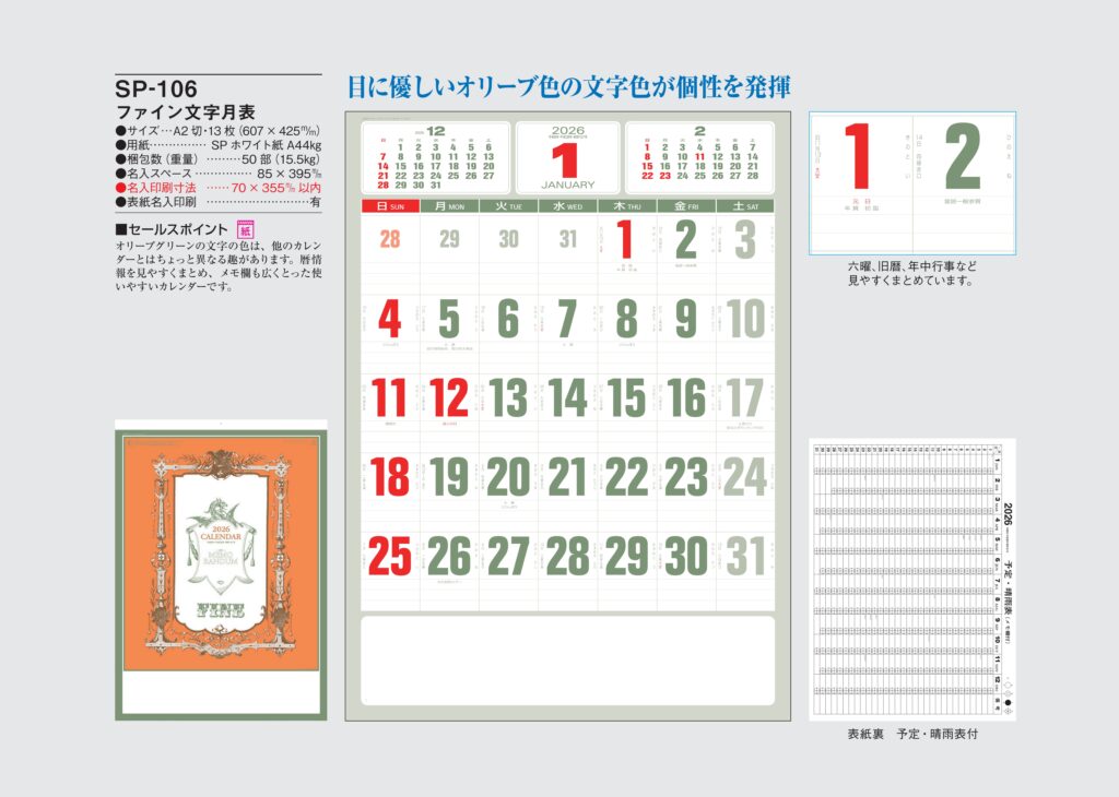 品番 : SP-106 A2切/13 ファイン文字月表 : 2026年版