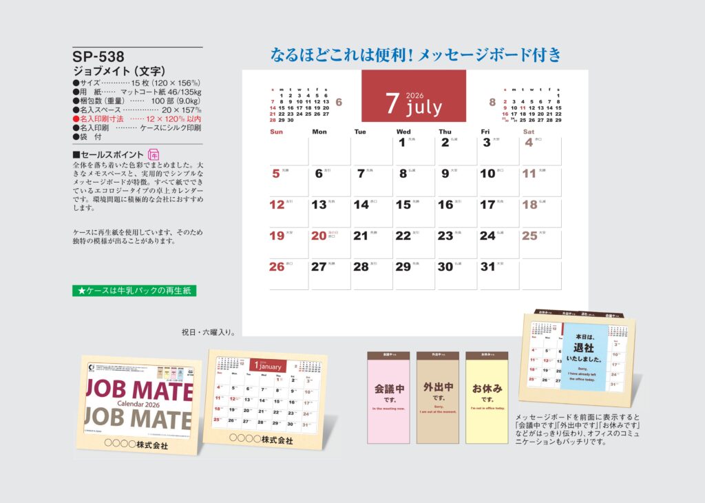 ・ -,2026年度 カレンダー,sp538, 最安値,sp-538,SP538,ジョブメイト(文字)