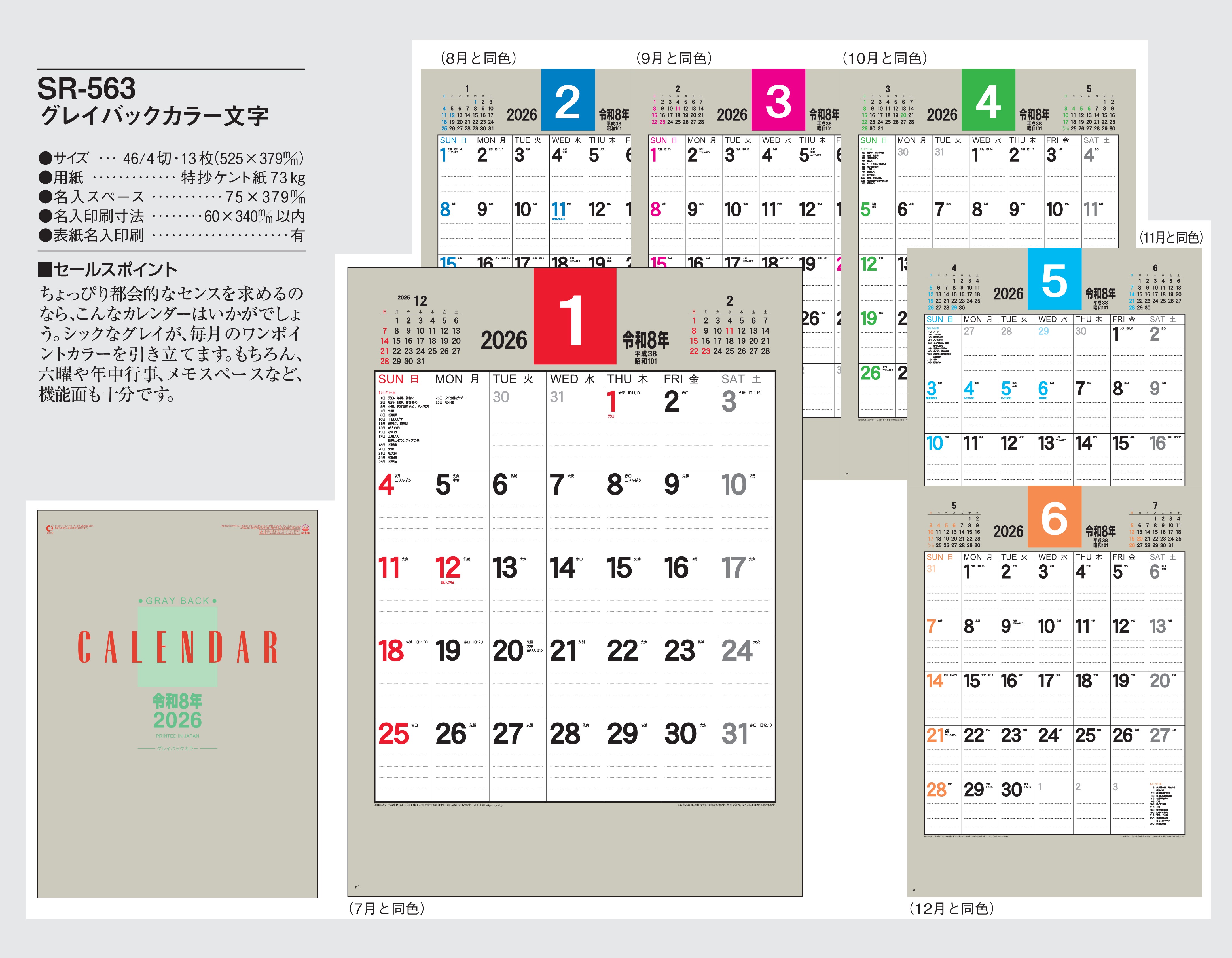 品番 : SR-563 46/4-13枚 グレイバックカラー文字月表 : 2026年版