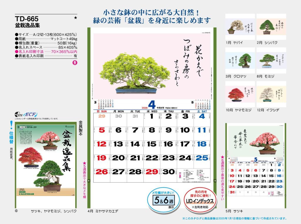・ -,2026年度 カレンダー,td665, 最安値,td-665,TD665,盆栽逸品集
