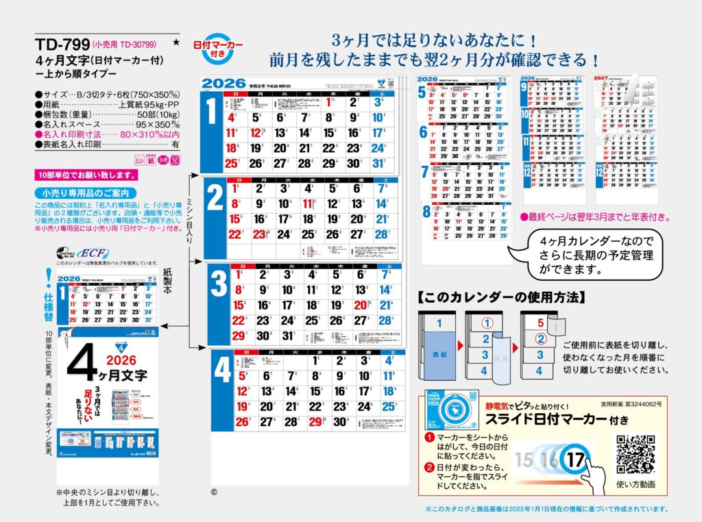 ・ -,2026年度 カレンダー,td799, 最安値,td-799,TD799,4ヶ月文字-上から順タイプ-
