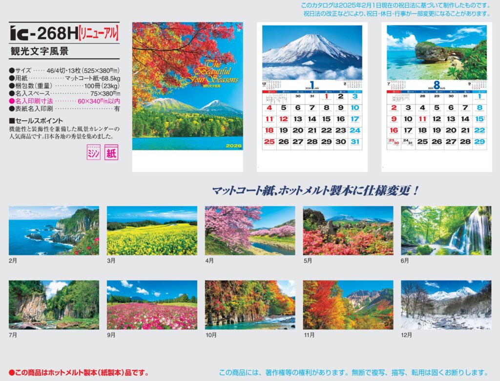 商品詳細 品番 : IC-268 46/4×13 観光文字風景 : 2026年版 < 日本を代表する景勝地に季節感をマッチさせた心やすまるカレンダーです。 IC268 ◆現在メーカー【在庫豊富】 ●キャンペーン割引価 […]