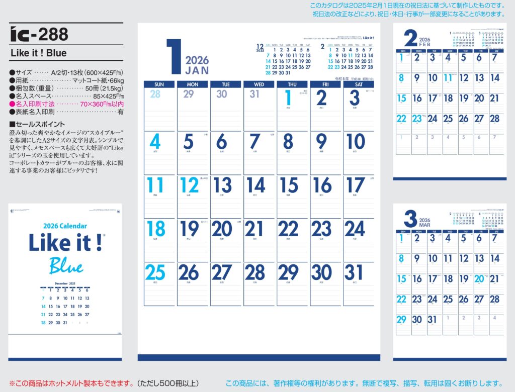 商品詳細 品番 : IC-288 A/2×13 Like it! Blue : 2026年版 < ★おすすめカレンダー ◆現在メーカー【在庫豊富】 ●キャンペーン割引価格中の8月31日までにご注文をお願いします。 20~ […]