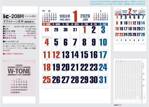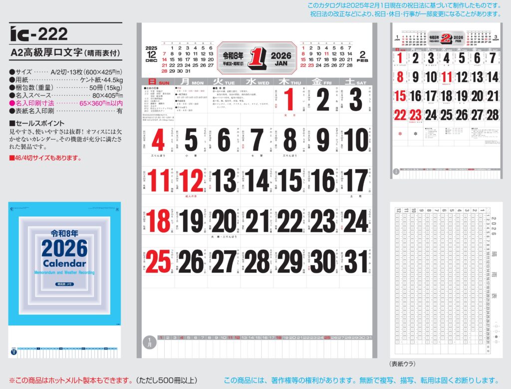 商品詳細 品番 : IC-210 46/4×13 高級厚口文字月表 : 2026年版 < レギュラーサイズ一般的なサイズの名入れカレンダーです。 IC210 ◆現在メーカー【在庫豊富】 ●キャンペーン割引価格中の8月 […]
