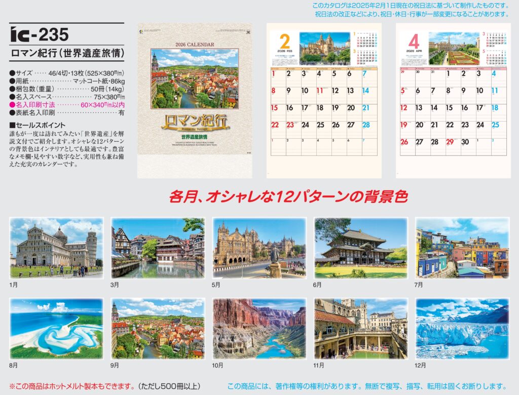 商品詳細 品番 : IC-235 46/4×13 ロマン紀行 : 2026年版 < メモ欄重視で「世界遺産」のカレンダーを選ぶなら、これで決まりです!! IC235 ◆現在メーカー【在庫豊富】 ●キャンペーン割引価格 […]