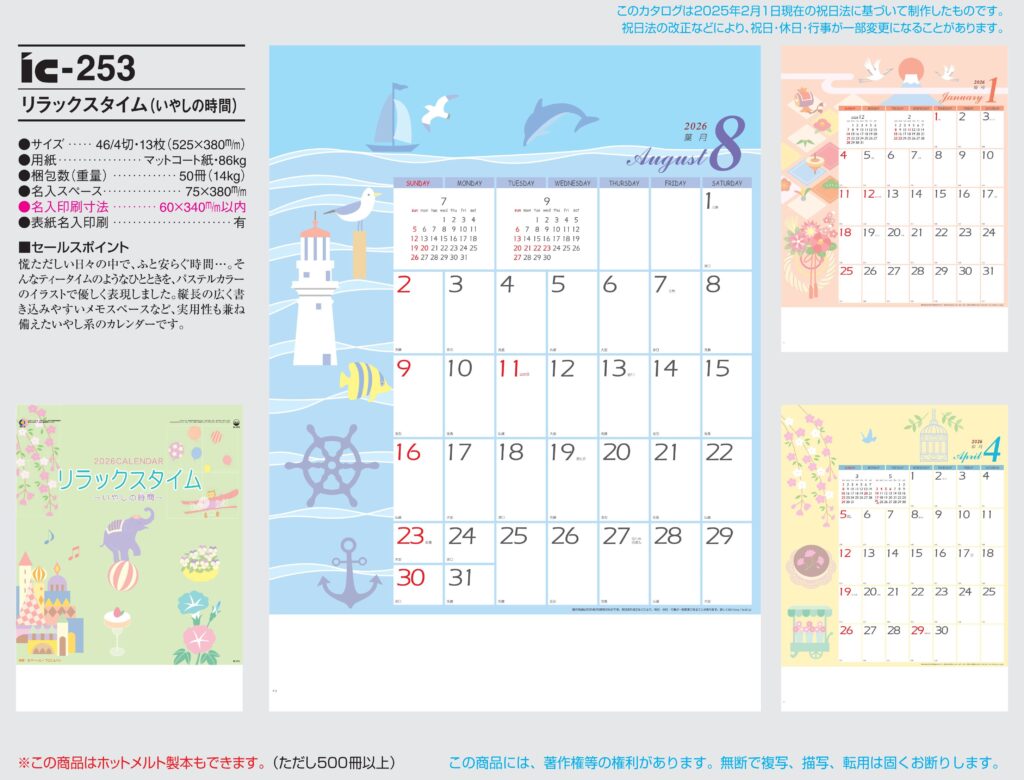 商品詳細 品番 : IC-253 46/4×13 リラックスタイム : 2026年版 < オフィスやお部屋を優しく彩るリラクゼーションカレンダー!! IC253 ◆現在メーカー【在庫豊富】 ●キャンペーン割引価格中の […]