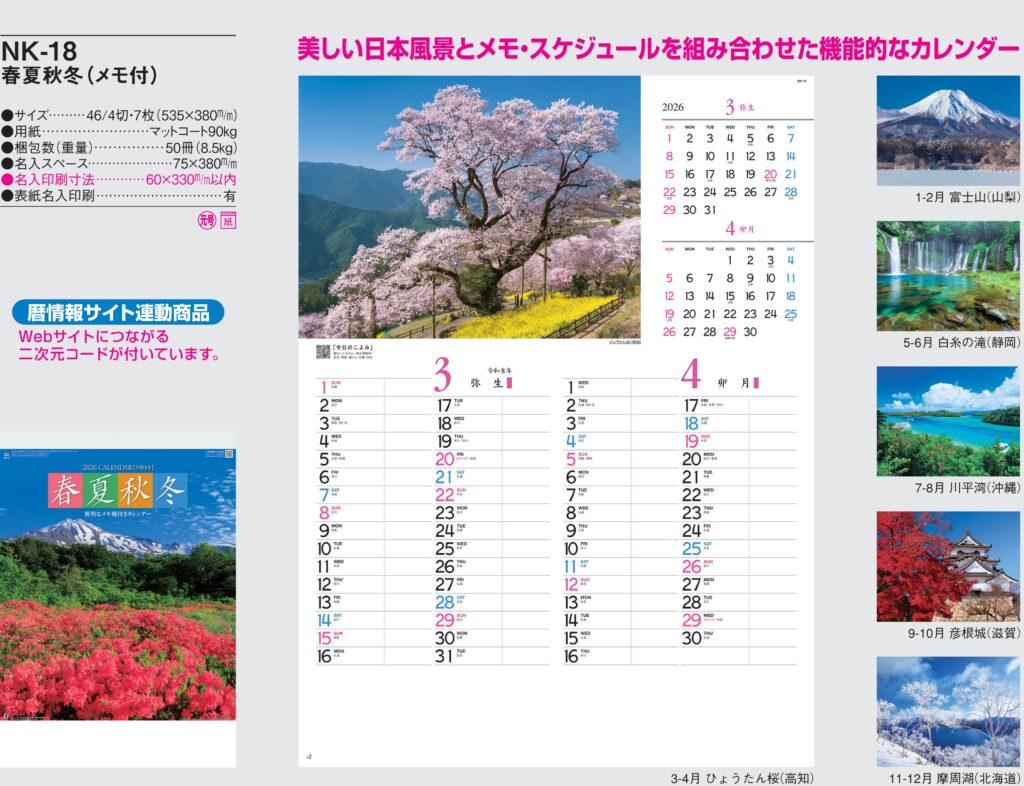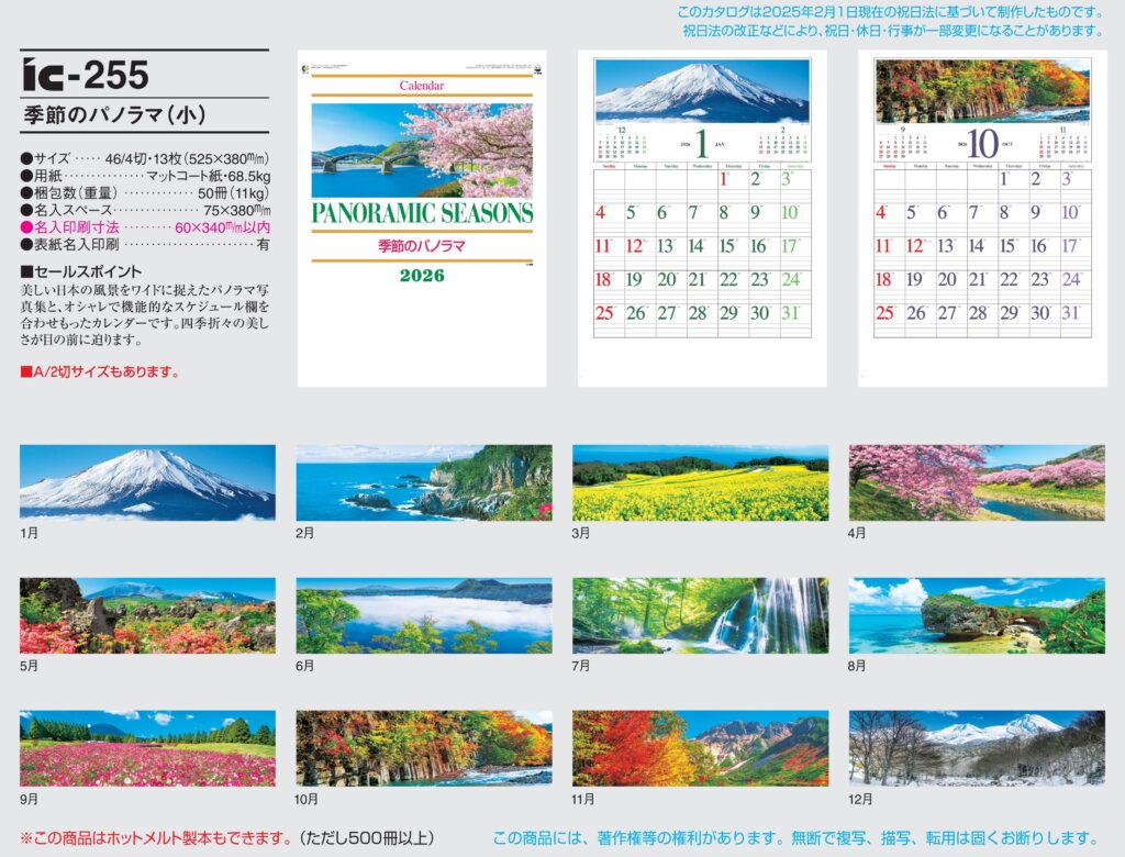 商品詳細 品番 : IC-255 46/4×13 季節のパノラマ(小) : 2026年版 < 美しい日本の風景をワイドに捉えたパノラマ写真の名入れカレンダー。 IC255 ◆現在メーカー【在庫豊富】 ●キャンペーン割 […]