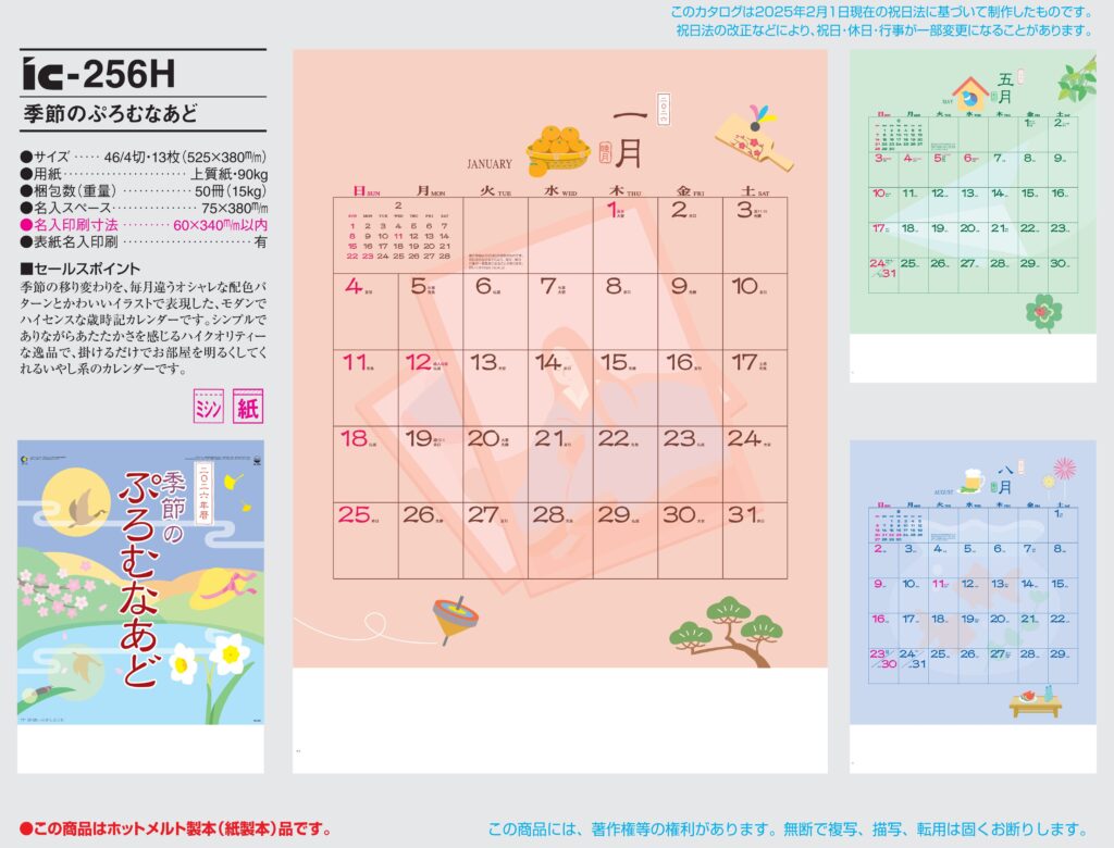 商品詳細 品番 : IC-252 46/4×13 四季の舞 : 2026年版 < 日本の自然美を草花や木々の変化をモチーフに優しいタッチで描いた情緒あふれる逸品です。 IC252 ◆現在メーカー【在庫豊富】 ●キャン […]