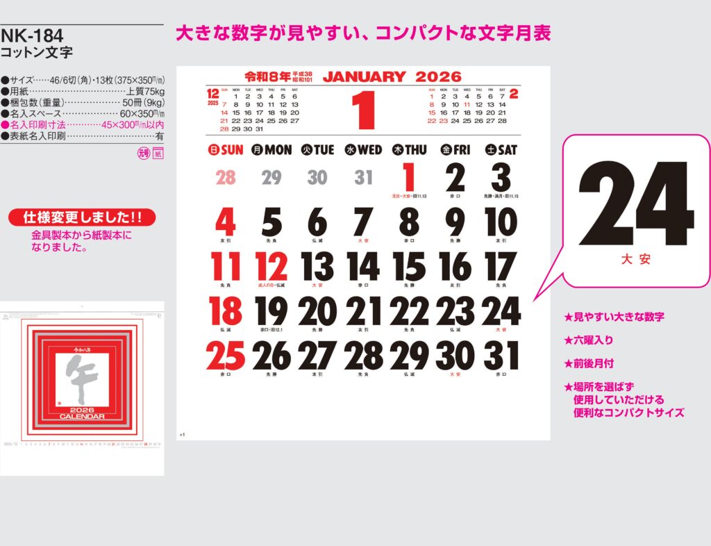 商品詳細 品番 : NK-184 B6角-13 コットン文字 : 2026年版 < 小さくても予定管理にベンリな名入れカレンダー。 NK184 ◆現在メーカー【在庫豊富】 ●キャンペーン割引価格中の8月31日までにご […]