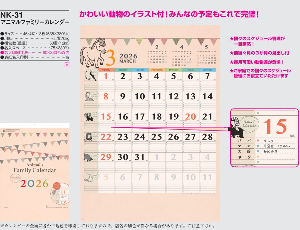商品詳細 品番 : NK-031 B4-13 アニマルファミリーカレンダー : 2026年版 < かわいい動物のイラスト付き!みんなの予定もこれで完璧! NK031 ◆現在メーカー【在庫豊富】 ●キャンペーン割引価格 […]