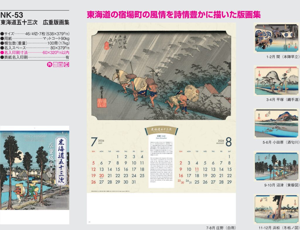 商品詳細 品番 : NK-053 B4-7 東海道五十三次 : 2026年版 < 東海道の宿場の風景を詩情豊かに描いた広重版画集のカレンダーです。江戸時代にタイムスリップして旅に出た気分がするかもしれません。数字も見 […]