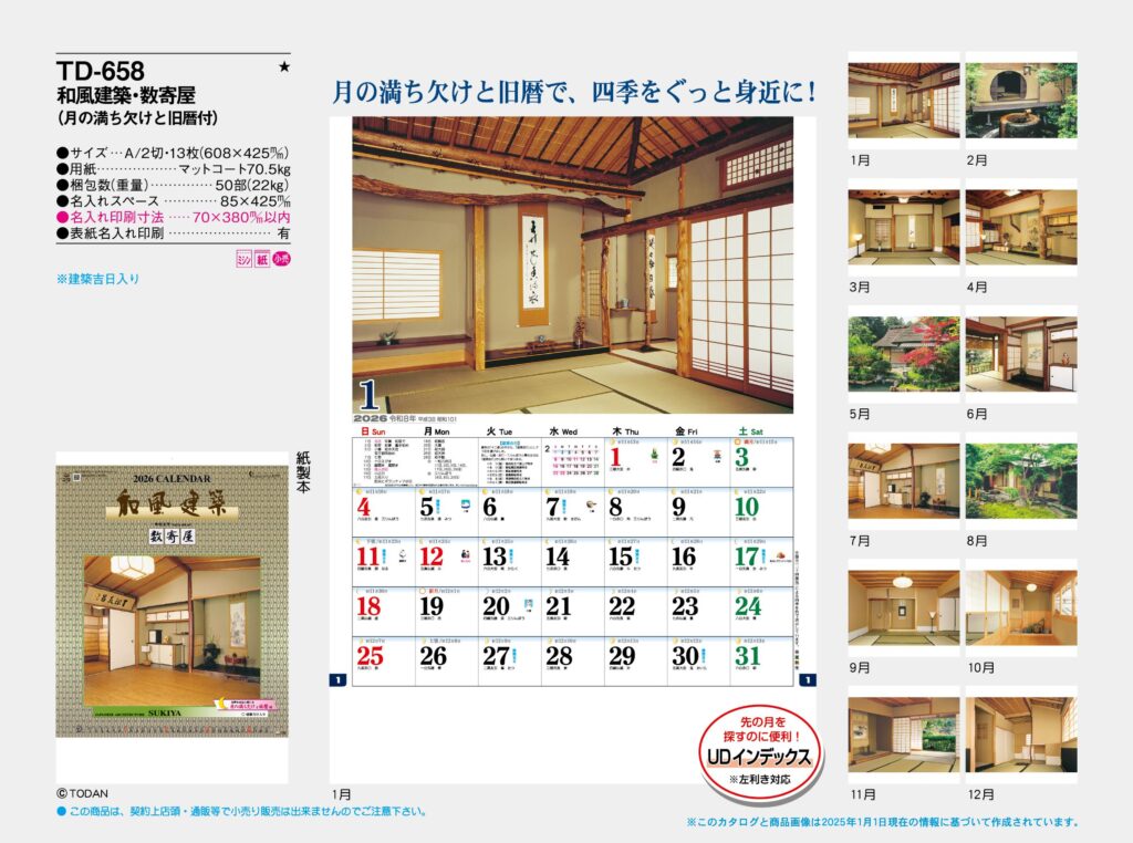 商品詳細 品番 : TD-658 A/2-13H 和風建築・数寄屋(月の満ち欠けと旧暦付) : 2026年版 < このカレンダーは『NK-145 和風建築・数寄屋(月の満ち欠けと旧暦付)』と同じ商品です。 TD658 […]