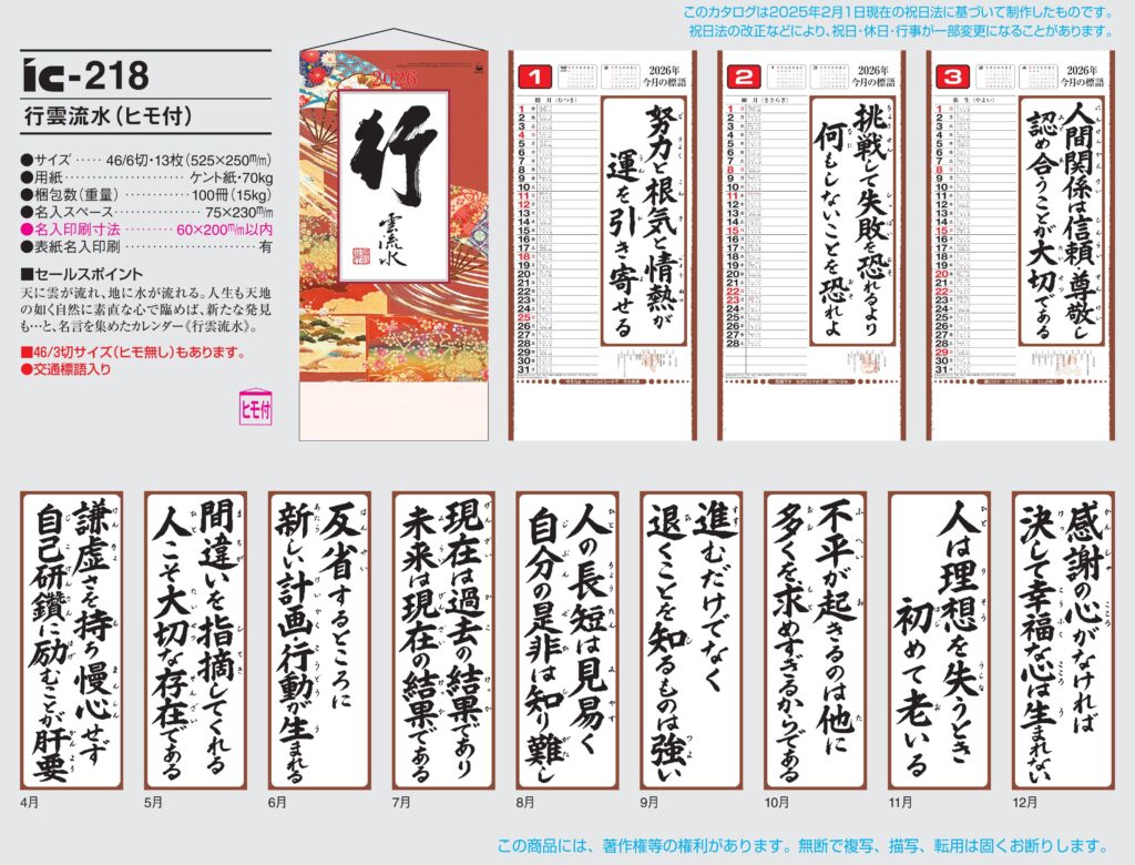 商品詳細 品番 : IC-218 46/6×13 行雲流水 (ヒモ付) : 2026年版 < 天に雲が流れ、地に水が流れる。人生も天地の如く自然に素直な心で臨めば、新たな発見も…と、名言を集めたカレンダー≪行雲流水≫ […]