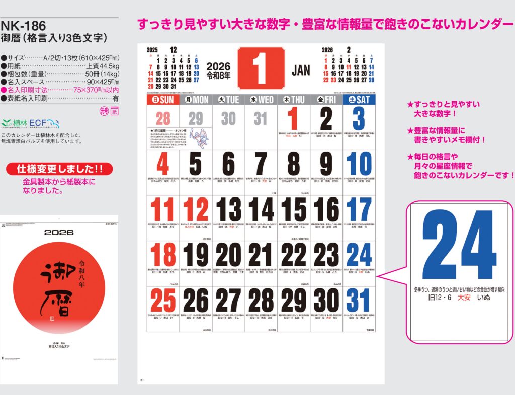 商品詳細 品番 : NK-186 A2-13 御暦(格言入り3色文字) : 2026年版 < すっきり見やすい大きな数字・豊富な情報量で飽きのこないカレンダー NK186 ◆現在メーカー【在庫豊富】 ●キャンペーン割 […]