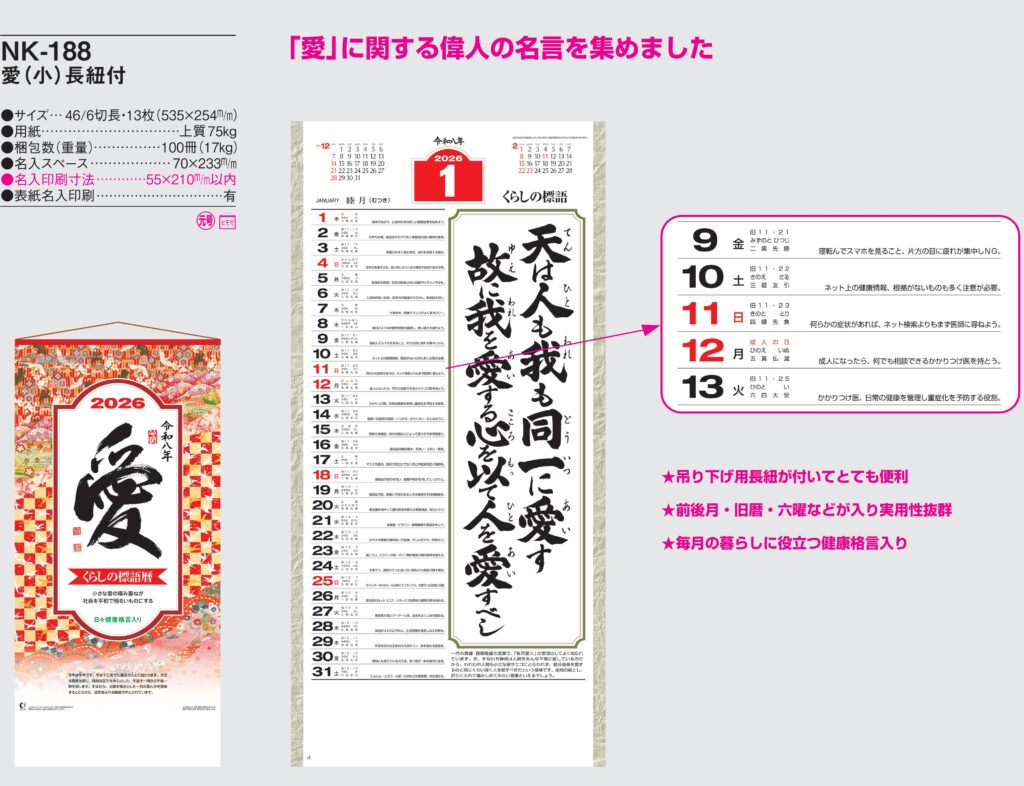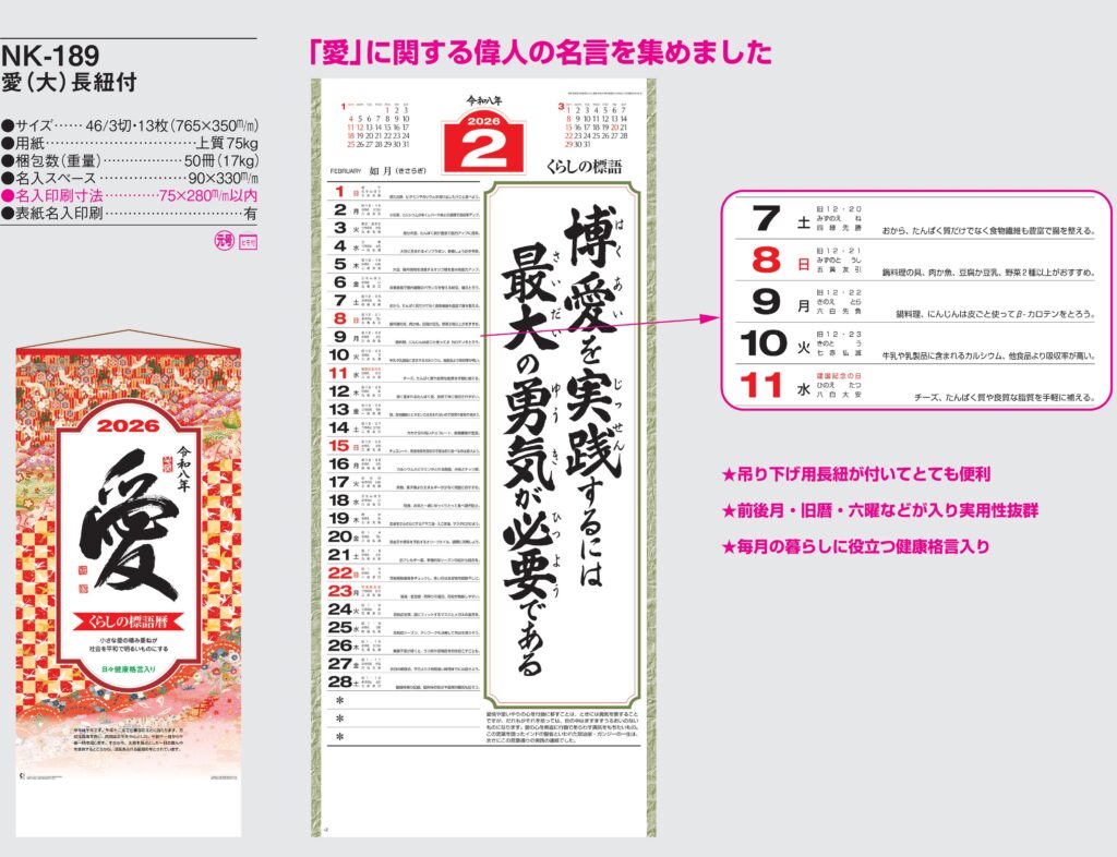 商品詳細 品番 : NK-189 B3-13 愛(大)長紐付 : 2026年版 < 毎月の暮らしに役立つ健康格言入り NK189 ◆現在メーカー【在庫豊富】 ●キャンペーン割引価格中の8月31日までにご注文をお […]